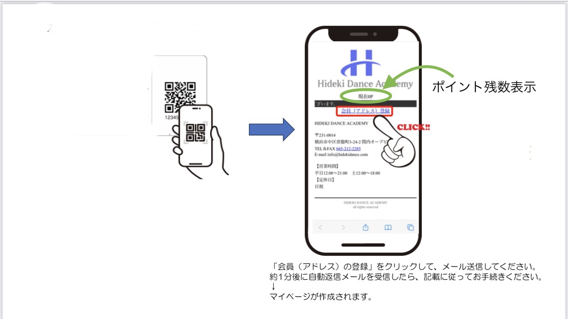 ブルーのポイントカードの裏面のQRコードをお手持ちの携帯などのモバイルツールより読み込んで頂きますと、お持ちのポイント残数をご覧になれます。(図の緑の◯に表示)